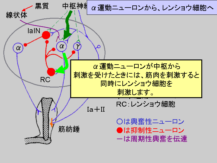α運動ニューロンは筋肉を収縮させると同時に、レンショウ細胞を興奮させます。