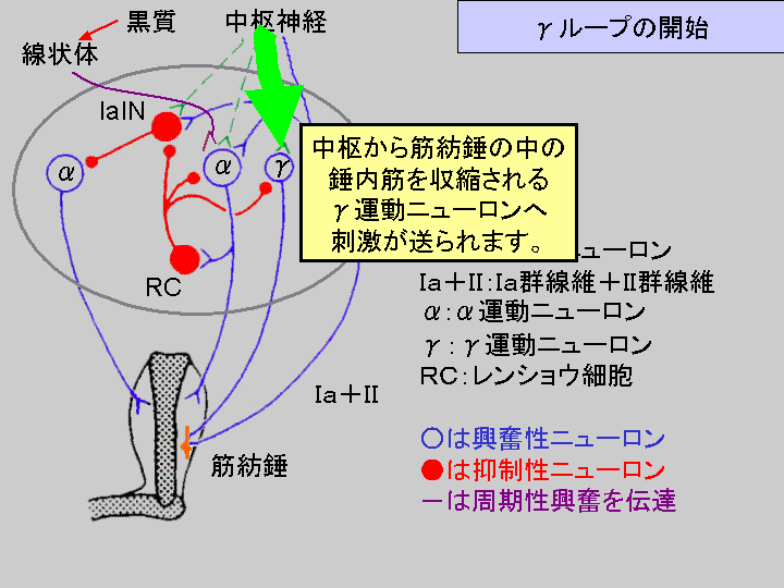 中枢から筋肉の中にある感覚器に行くγ運動ニューロンに刺激がきます。